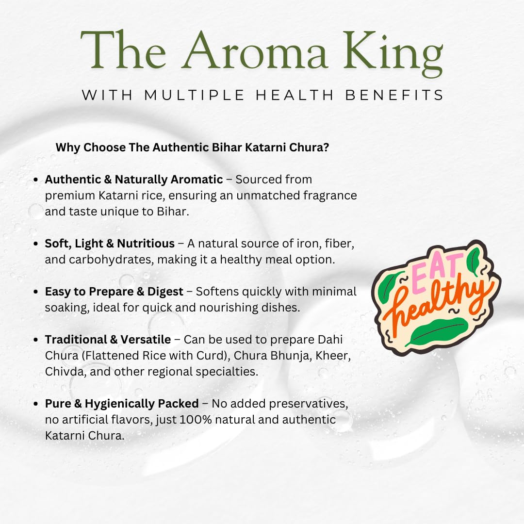 ✅ Premium Katarni Chura (Flattened Rice) – Crafted from high-quality Katarni Chawal, a celebrated rice variety of Bihar, known for its fine grains, soft texture, and naturally rich aroma.
